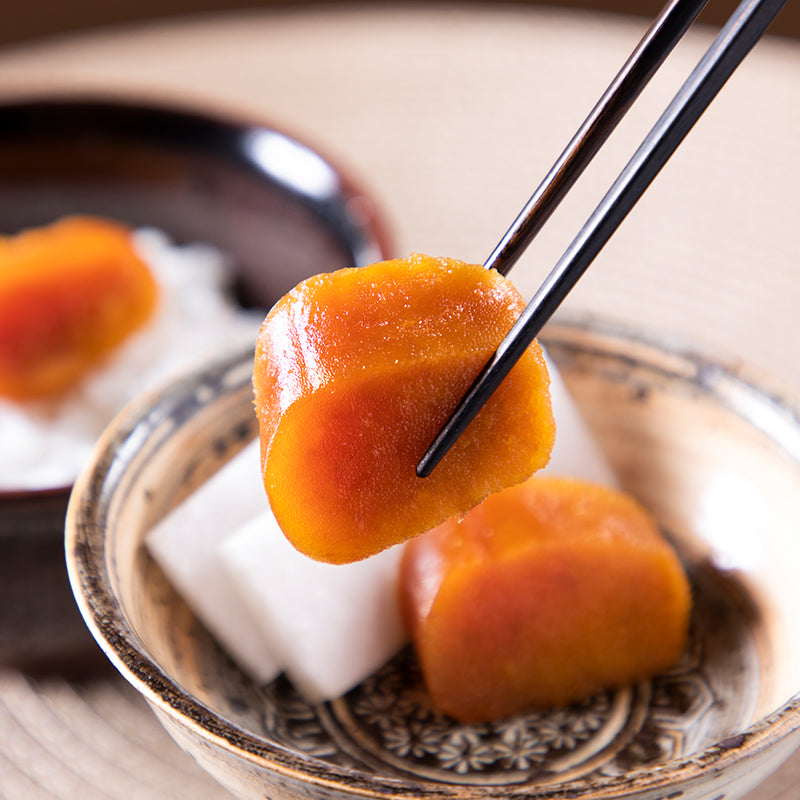A. 普通のからすみは固く、塩気が強いため、薄く切って大根などと一緒に少しづつお召し上がりになる方が多いですが、レアからすみは塩干し後に旨味を注入しているため、柔らかく、塩気の少ない味わいになっています。お酒やワインだけでなく、ご飯のお供にもオススメです。是非厚切りで贅沢にお召し上がりください。