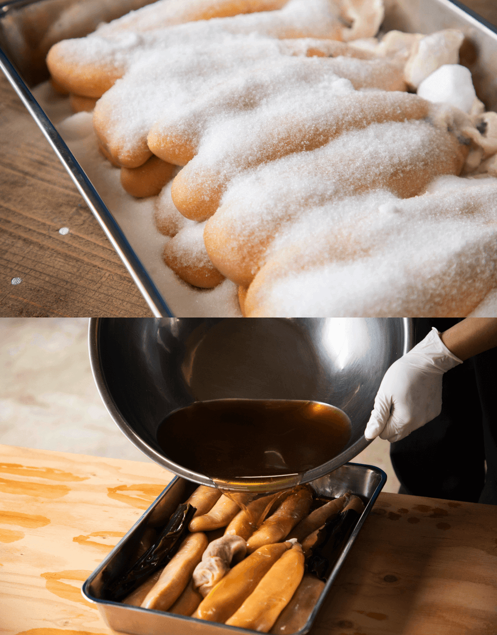 国産ボラ卵の仕入れは、長年お付き合いある豊洲市場の高級鮮魚「魚貴」さんから仕入れています。 一つ一つサイズが違うものも仕入れることで仕入れ価格を抑えられます。その分、仕込みの手間が増えるのですが、それで皆さんにこのレアからすみを少しでも味わってもらえるのならこれ以上の喜びはありません。 基本に忠実に手間を惜しまないことで本当に美味しいものが出来上がります。 高田代表「表面は良くても後ろを見てみると傷が入ってたりとか、出来るだけそういうものがないように。"信頼関係"。お客様に下手なものは出せないのでなるべくより良いものを出すように心がけています」